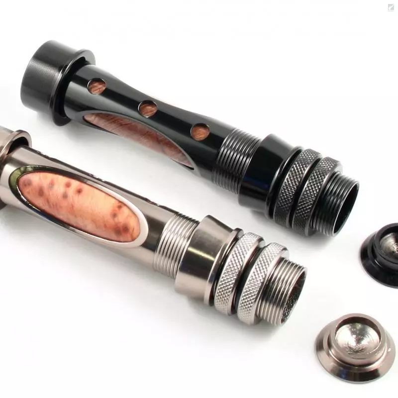 Popular window reel seats with woven graphite or burled wood inserts from ATC. Double locking nut design with inset black lock-ring. Loose end cap so can be also used with fighting butt. For line weights 4-8. Hardware titanium or black.