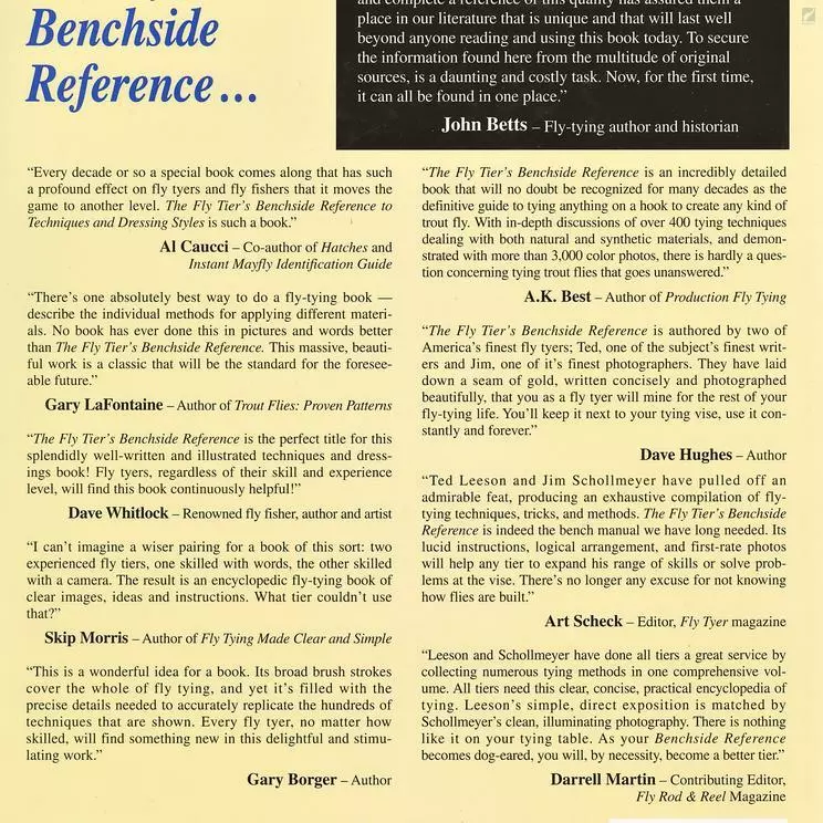 Gary LaFontaine: “There’s one absolutely best way to do a fly-tying book–describe the individual methods for applying different materials. No book has ever done this in pictures and words better than The Fly Tier’s Benchside Reference. This massive, beautiful work is a classic that will be the standard for the foreseeable future.”