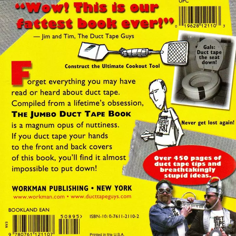 Did you know that duct tape can turn any item of clothing into rainwear? That duct tape over a computer screen will keep your kids from surfing naughty sites on the Web? That a perfect solution for those easy-to-lose TV remotes is to duct tape them to your arm? (Not only won’t you lose it, you’ll never have to relinquish control over it, either!) But can you also believe that Jim & Tim’s creative ideas for duct tape spawned not just one bestselling book, but three, plus a calendar? And now the ultimate collection?