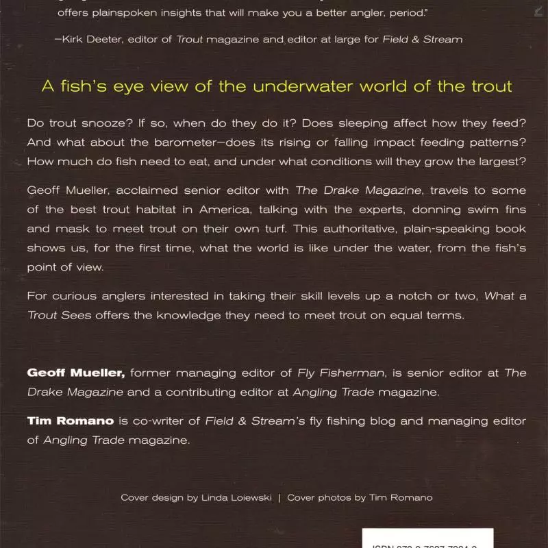 Geoff Mueller, acclaimed senior editor with The Drake Magazine, travels throughout some of the best trout habitat in America, talking with the experts and donning swim fins and mask to meet trout on their own turf. With What a Trout Sees, curious anglers interested in taking their skill levels up a notch or two will finally have all the information they need.