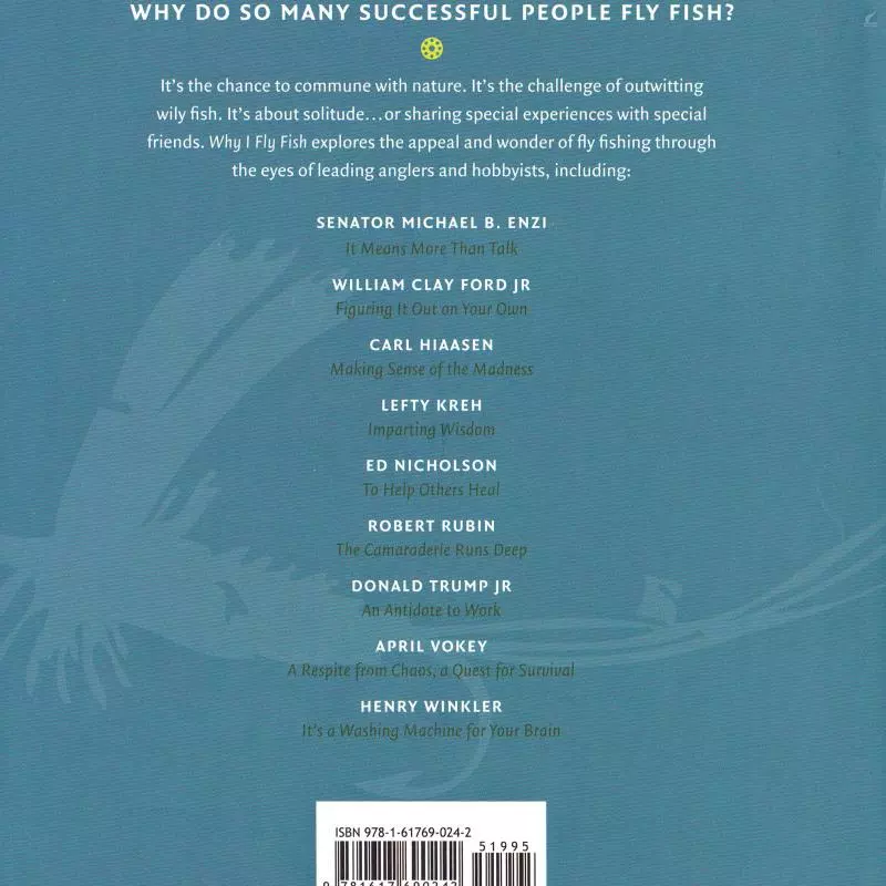 Why I Fly Fish encapsulates the life lessons fly-fishing aficionados have learned from their favorite pursuit. Featured contributors include Donald Trump Jr., Bill Ford (CEO of Ford Motor Company), Conway Bowman (host of several flyfishing TV programs), actor Henry Winkler, Lefty Kreh and many more. With personal photographs by the contributors themselves, Why I Fly Fish is an inspirational and intimate reflection on the beloved sport and pastime.